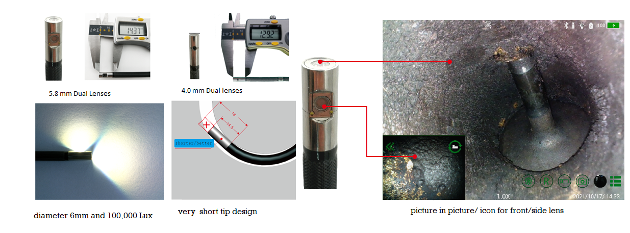 - Front twin lenses with short/long focus for narrow/wide space inspection quickly to get the flow and no waste time to change the lens.