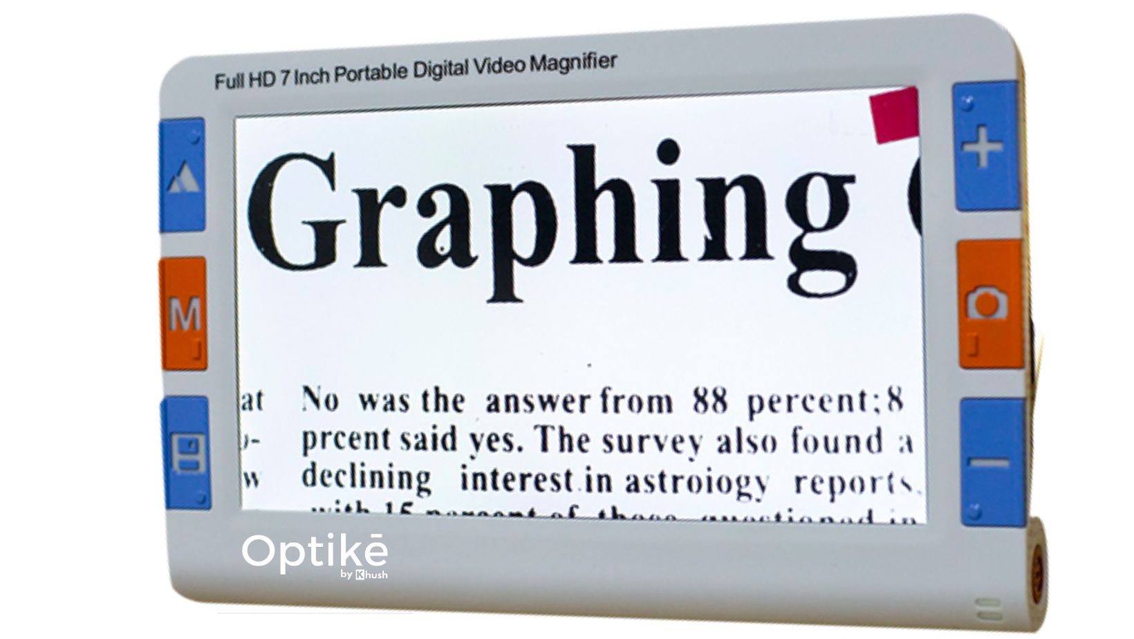 An Optike Brand 7.0-inch Portable LCD Video Magnifier has a high-definition camera with a high-quality image and stable viewing. This LCD magnifier is ideal for spot reading. This portable vision aid is suitable for anyone with vision loss who is looking for an independent living product that is easy to use and that provides a clear, sharp image. It offers up to 32X infinite magnification, a comfortable built-in handle, and a 5200mAh rechargeable battery.