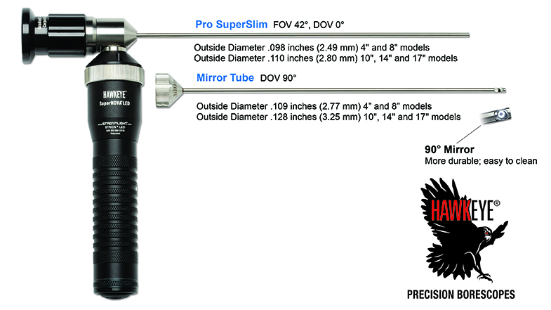 At .098 inches in diameter, or .109 inches with a mirror tube, the Hawkeye® Pro SuperSlim Borescopes give sharp, clear views of the microscopic holes in spray tips and nozzles.