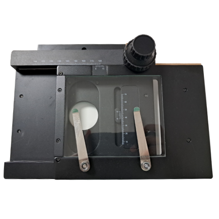 This mechanical stage contains controls for right-handed microscopists that allow the movement of the specimen slide in both the X (right and left) and Y (back and forth) directions so the microscopist can examine the entire microscope slide (secured to the stage with the slide holder).