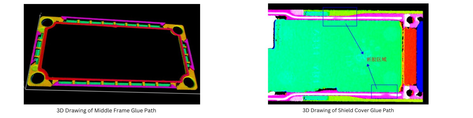 - Advantage: One scan imaging calculation, no need any movement. complex texture, good imaging, high precision ,with self- developed operator to accurately judge the quality of the glue road.