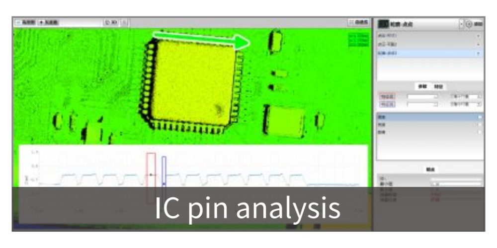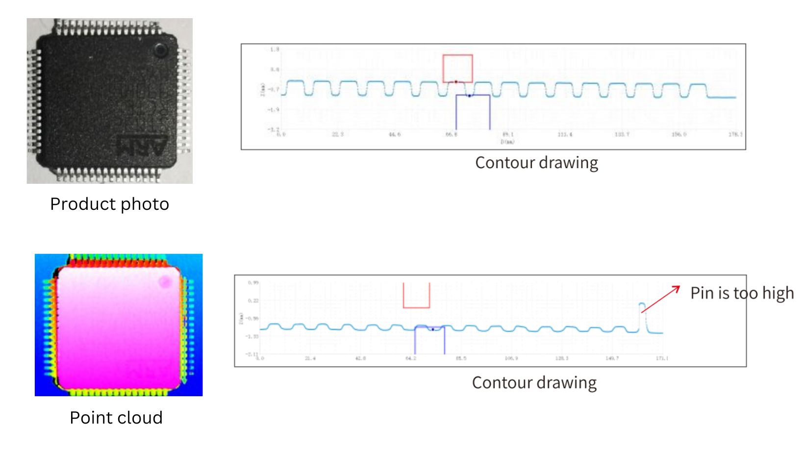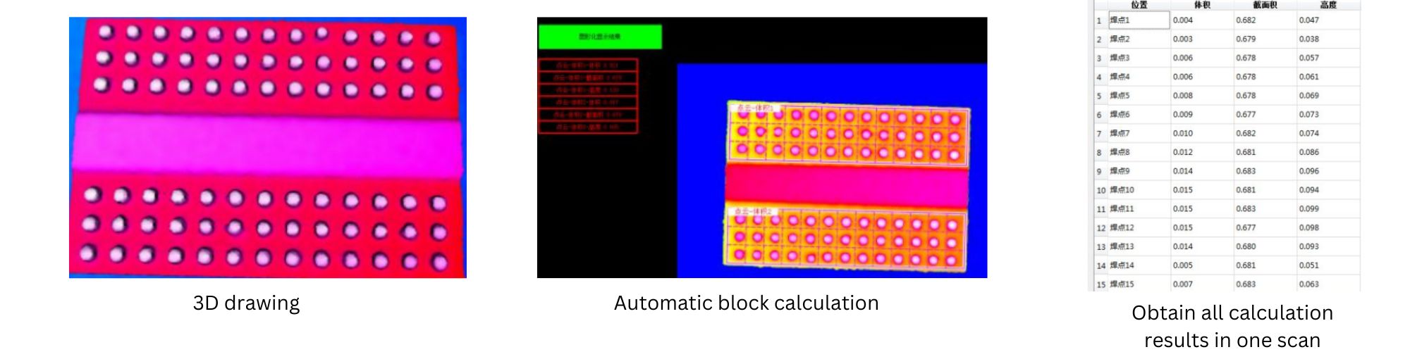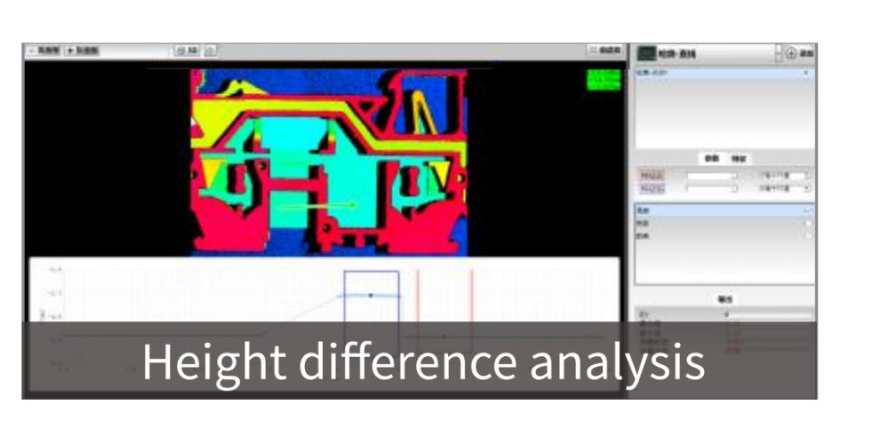 - Advantage: One scan imaging calculation, no need any movement, and detection of the height of various materials at the same time. A single scan can get regular height abnormalities, solder abnormalities, device connection abnormalities, etc.